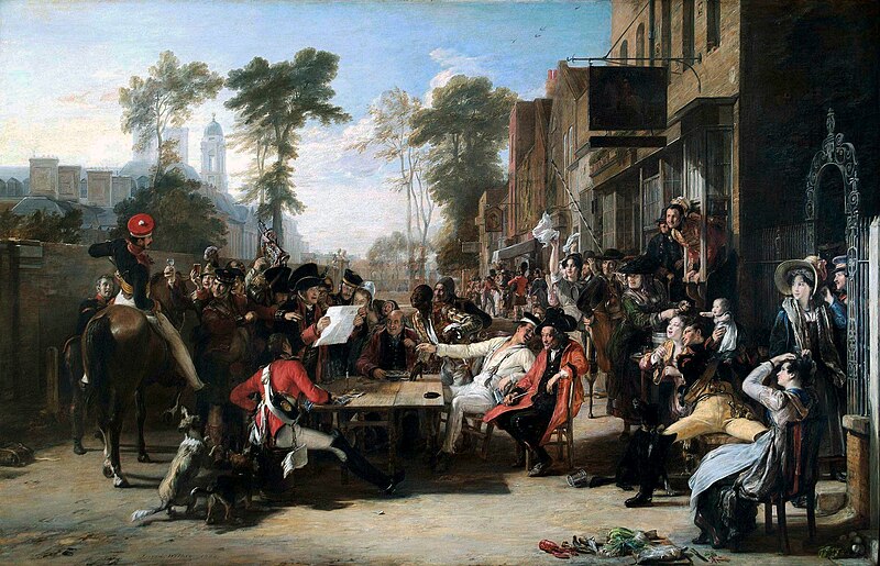 With the turn to genre and narrative painting in the early Victorian era, heroic figures were democratized compared to the mythic heroic figures in history painting of the eighteenth century and before. After Benjamin West’s Death of General Wolfe (1770-71), the theme of patriotism was maintained, but Sir David Wilkie made heroes of ordinary soldiers in Chelsea Pensioners Receiving the London Gazette Extraordinary of Thursday, June 22, 1815, Announcing the Battle of Waterloo (exhibited 1822). The new way to depict the heroic figure in this painting was as soldiers on a pension in a pleasant suburb, celebrating the final victory of the Napoleonic wars.