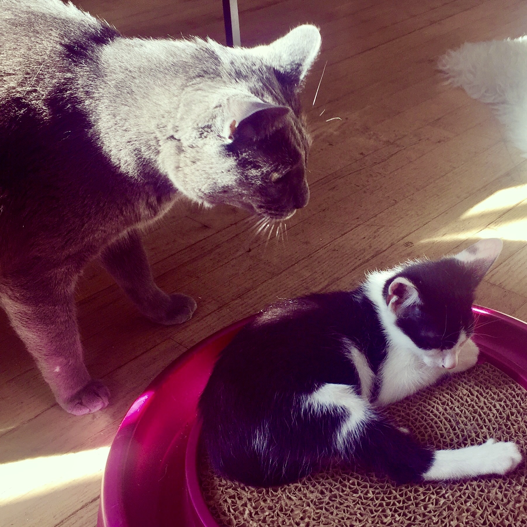 A friend of a friend found a tiny kitten in a box on the street in Brooklyn and posted about it on social media. Within 24 hours we were picking her up and taking her to the vet before introducing her to her new big brother. We named her Duckie (short for Duchess to go with her brother Duke).