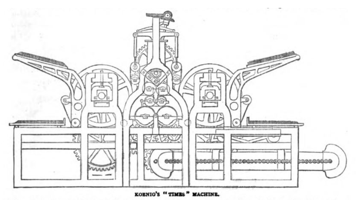 Koenig’s double cylinder press made specially for the London Times from A Short History of the Art of Printing in England by Arthur C. J. Powell, 1877. From HathiTrust.