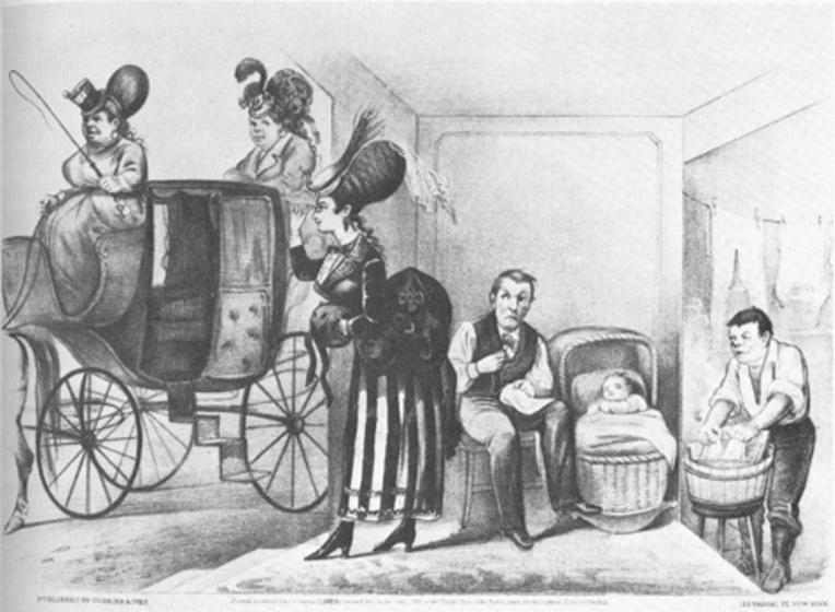 This print depicts a major shift in gender roles. There are two men carrying out tasks that women of the Victorian Era (1837-1901) would normally be expected to accomplish. One man is sewing and the other is washing clothes, and both are looking after a child. The men are looking at the women with very hateful gazes. There is a very well-dressed and sophisticated looking woman stepping into a horse-drawn carriage that is being run by two other women. The print shows a stark contrast between the normal gender roles of the time and what gender roles could become in the future. It also highlights the feelings that women have about the stereotypes of women during the Victorian Era. Because the genders are swapped in this drawing, the men express the hatred and envy that the women of the time, especially the New Women, would have of men’s freedom.