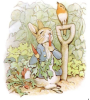 In Peter Rabbit, Peter is followed by a small robin as he disobeys his mother’s instructions and explores Mr. McGregor’s garden. The robin shown in this first plate appears 6 times throughout the book, a repetition which makes the bird a motif. It can be inferred that the robin represents Peter's father, who was killed in that same garden. Peter's mother tells him not to go into the garden, so the bird is watching over Peter with a fatherly disapproval, emphasizing lessons of obedience and proper behavior. The presence of this robin, never mentioned in the book, is subtle yet significant. Peter believes that he escapes from his mother’s watchful eye, but he is truly never void of observation and is constantly subject to parental influence. This is a playful tale about a naughty rabbit who has an adventure, but the robin is a reminder to discerning readers that children were expected to be obedient and well behaved at all times.