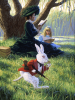 Alice in Wonderland is an entertaining book for children that also incorporates parody of the Victorians. Carroll uses many secondary characters to represent his parodic approach and to entertain his readers. The White Rabbit can be seen as a facilitator of Alice’s adventures. He leads her into Wonderland and develops somewhat of a friendship with Alice throughout the tale. In this 1990 image (plate 2), illustrator Greg Hildebrandt captures Alice's entrance into the enchanting world of Wonderland. Reading her book, she notices a rabbit running by and holding a pocketwatch. This image anticipates how she will soon run after the rabbit and fall down the rabbit hole into Wonderland. The White Rabbit introduces her to a world of adventure and accompanies her on her journey.