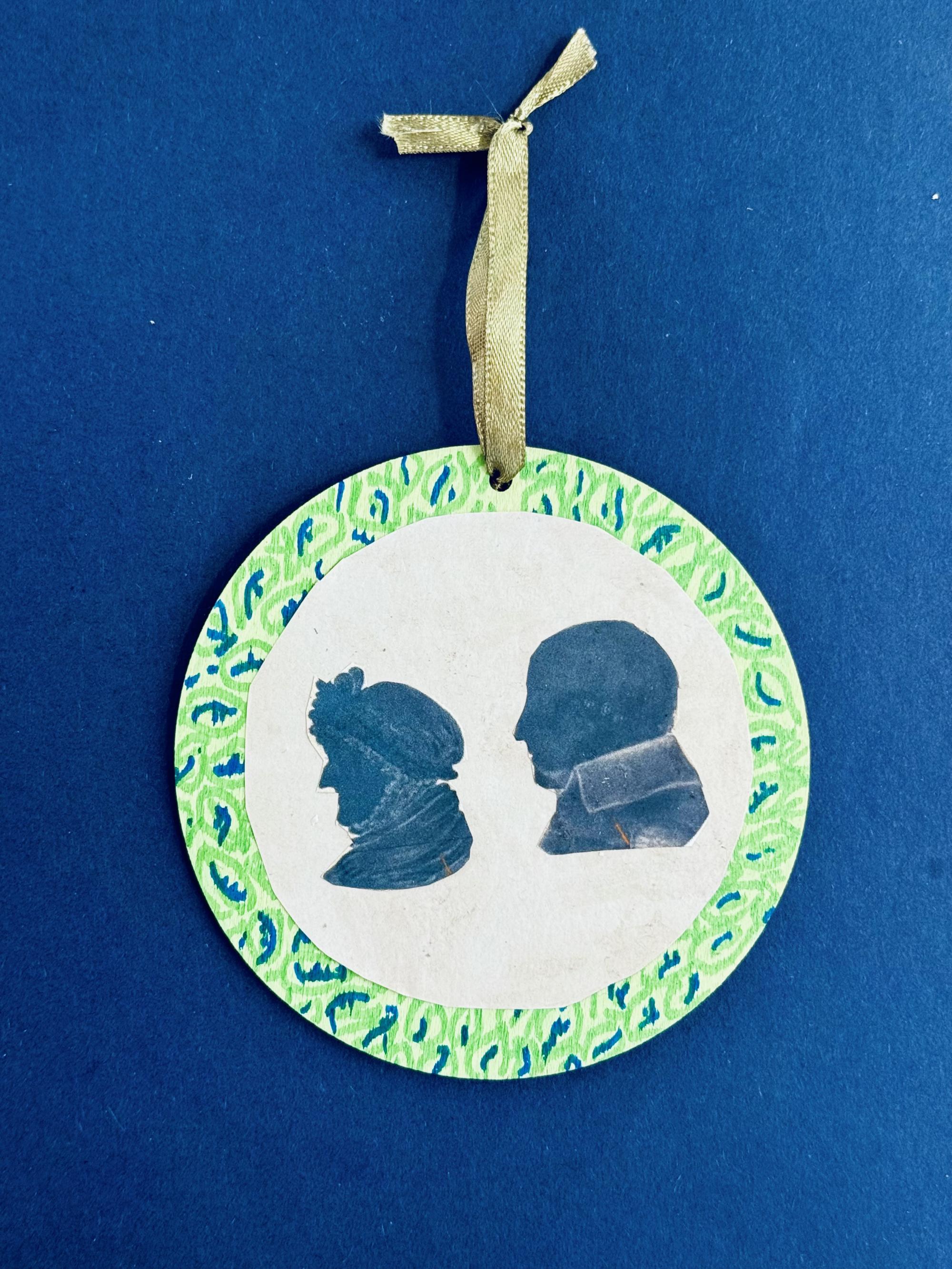 The Silhouette and the Critical Crafting Process, photograph by Catherine J. Golden, 2025. The process of creating a silhouette was very enjoyable since I have dabbled in this art form before. The inspiration for my double silhouette came from silhouettes on display at the Pierpont Morgan exhibition, "A Lively Mind: Jane Austen at 250.". I photographed the silhouettes and then printed them out. I tried cutting out the silhouettes and tracing them onto black paper. However, I realized that I would lose some of the details if I recreated the silhouette only in black, so I used the cut out of the photo. Although the Austens were framed separately in the display, I decided to put them in one frame. I also experimented with various colors for the background and settled on a green. As the picture shows, I experimented with an orange background to pick up the color in the framing of the original images, but I found green a better choice. I then used a dark green and blue marker to recreate the leaf patterned wallpaper used in the exhibition as a backdrop for the silhouettes (see the third image in this case). This leaf pattern serves as a border or frame for the double silhouette. The silhouette has a gold ribbon to be mounted on a wall.