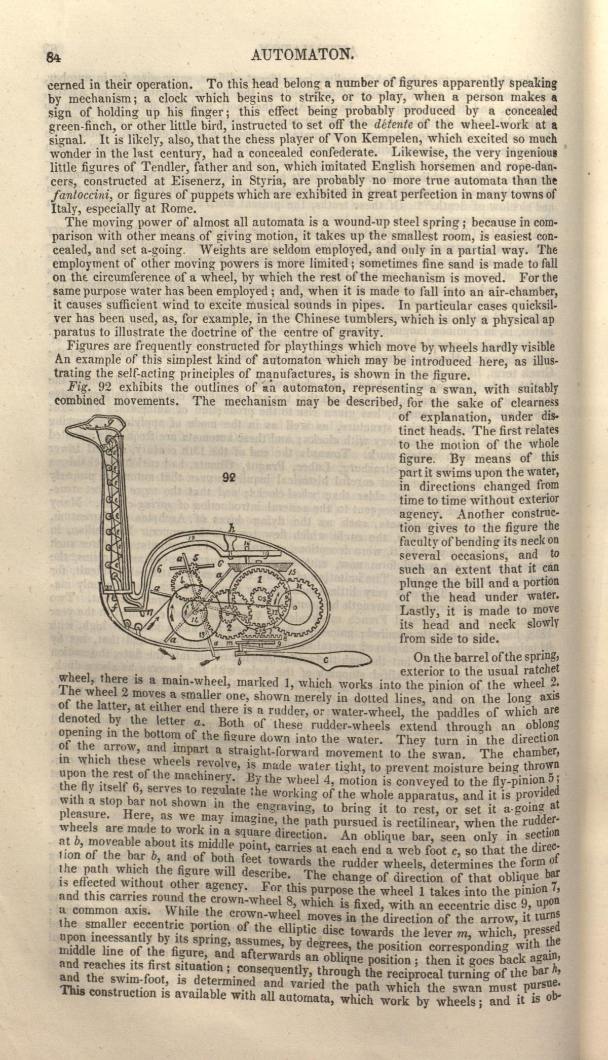 Fig. 92 exhibits the outlines of an automaton, representing a swan, with suitably combined movements. The mechanism may be described, for the sake of clearness of explanation, under distinct heads. The first relates to the motion of the whole figure. By means of this part it swims upon the water, in directions changed from time to time without exterior agency. Another construction gives to the figure the faculty of bending its neck on several occasions, and to such an extent that it can plunge the bill and a portion of the head under water. Lastly, it is made to move its head and neck slowly from side to side. (84)The inside of the swan’s body is depicted as a series of interlocking and carefully numbered and lettered gears. Behind the duck extends a rudder, which helps it to swim. The neck, “the part which requires the most careful workmanship,” is shown as a series of interlinked triangles representing a steel spring (85).
