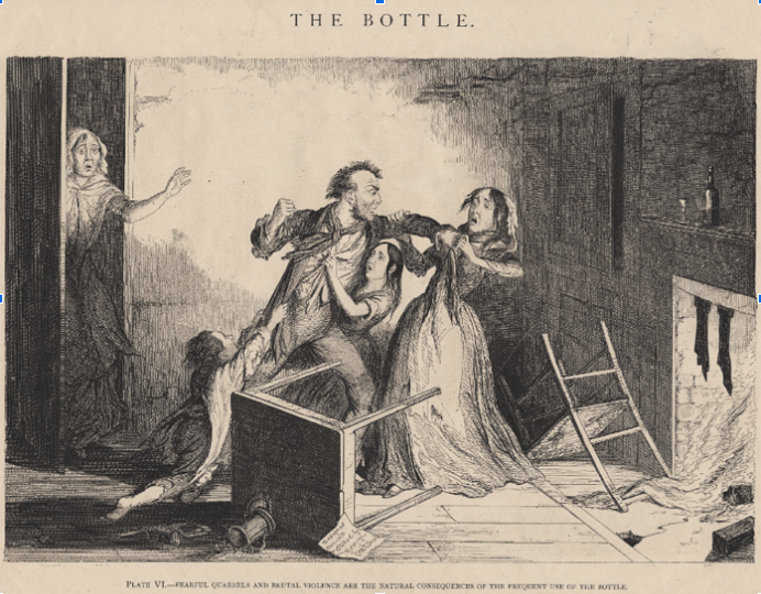 One of the eight plates created by George Cruikshank depicts a man’s descent into alcoholism. Ironically, Cruikshank himself was an alcoholic along with his brother and father. As such, Cruikshank’s advocation for abstinence stemmed from a personal experience of poverty, violence, and crime. The image is just one of the eight plates that Cruikshank created, with the others tying along to the story of a father, seemingly happy with his life and his family, descending into madness fueled with alcoholic rage towards his loved ones. The latter images depict his violence stemming from poverty and frustration at their situation, culminating with the murder of his own wife. Many argued that the low price of alcohol during this time encouraged the inevitable journey from the first sip of a drink to subsequent poverty and death. Cruikshank’s work attracted the attention of other notable authors, like Charles Dickens, who believed their world to be too demanding and cruel for total abstinence and rather argued moderation.