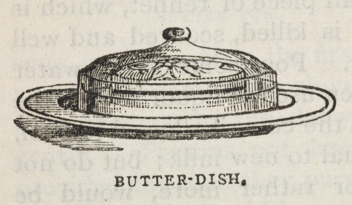 Illustration of a butter dish to accompany etiquette details in The Book of Household Management by Isabella Beeton. Beeton, Isabella. Butter Dish. London, 1861. Featured in Exhibit Butter: Lifeblood of the Victorian Tea Table Copyright © Vetted? No