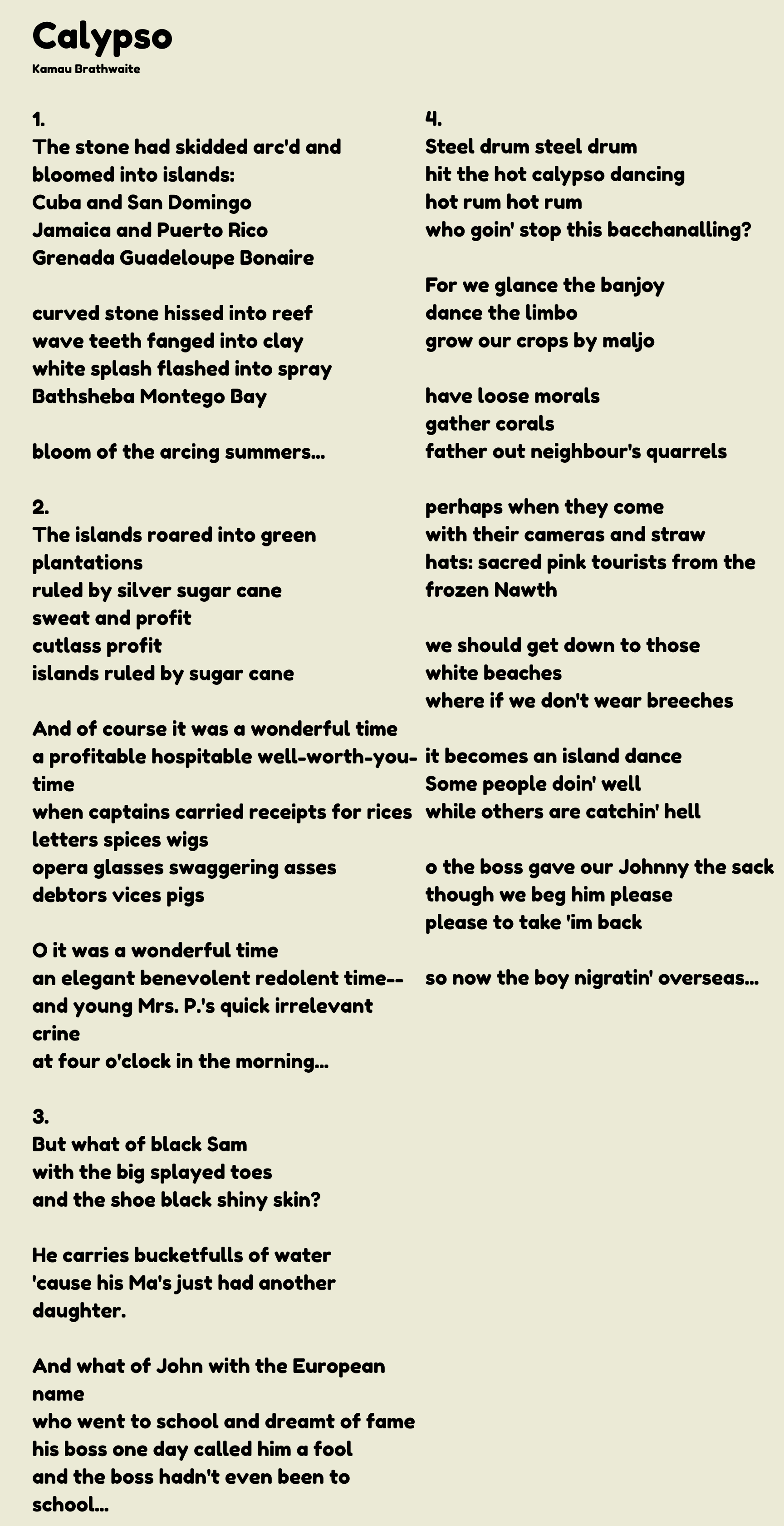 Inspired by Calypso music, this poem is as much a song as it is a social and political commentary. The rhymes and repetition add to the rhythm of the poem, which is meant to resemble Calypso music. The fourth portion draws a contrast in the lyrics between lines that would be seen in many traditional Caribbean songs versus the heavy tourism plaguing the islands as well as the lack of opporunities to leave the island and make a better life elsewhere.