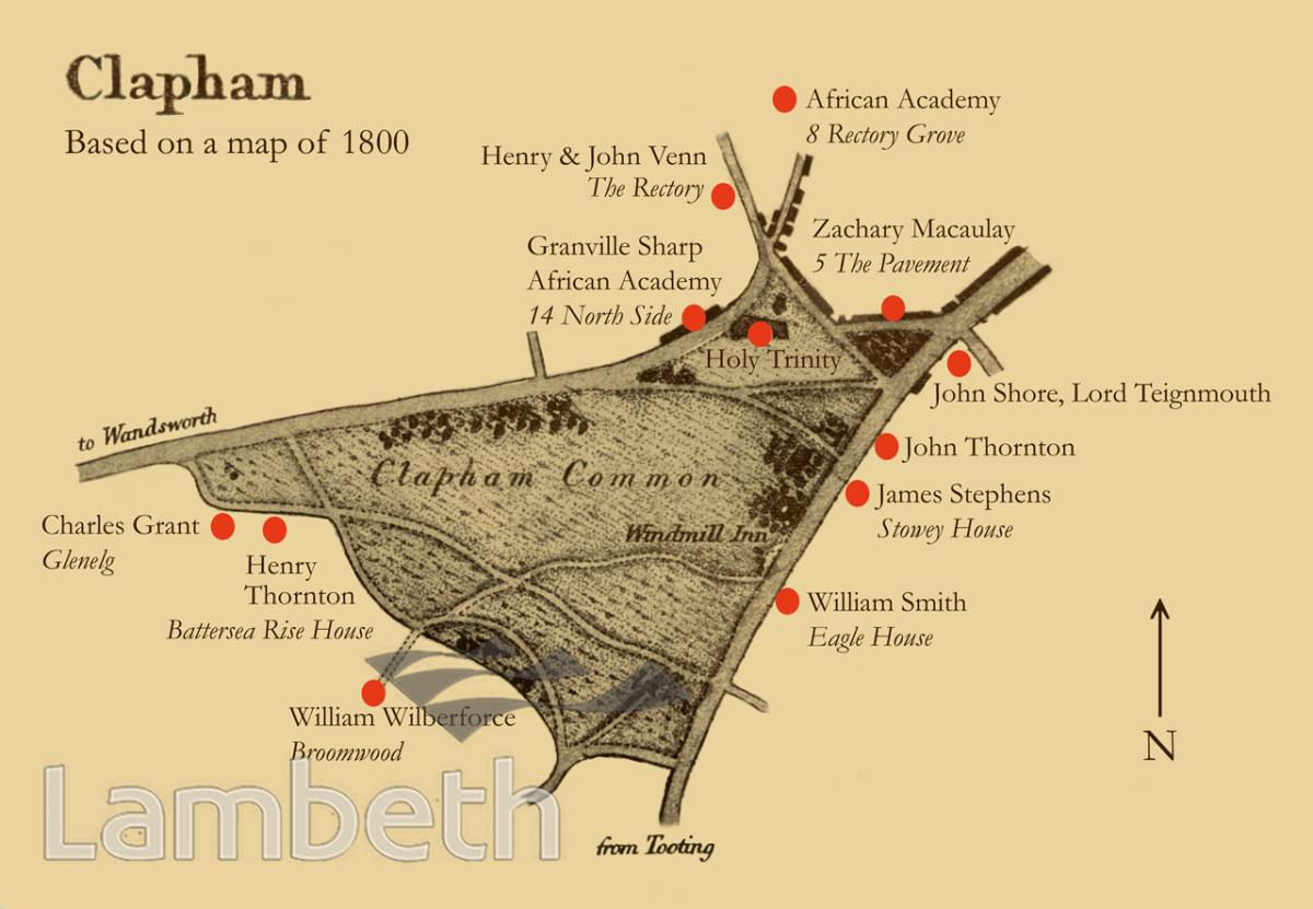 This is a map showing the layout of the town of Clapham as it would have been during the 18 hundreds. It shows the place where the Holy Trinity Church was during this time, as well as the prominent members' homes. This was the church where the first members of the Clapham Sect Abloliton group met, and where the group was formed. These members, their beliefs on slavery, and their efforts combined with other abolitionists such as More contributed to the creation and implementation of the Slavery Abolition Act of 1833.