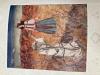 Central to the Oursler-Perkins edition of Rubáiyat of Omar Kháyyám are its colorful illustrative bookplates, courtesy of artist Gilbert James. Twelve of these inserts are scattered seemingly at random throughout the volume, their placement bearing relation neither to preceding nor subsequent quatrains. James’ work is rich in detail, focusing on a decidedly ‘exotic’ view of Kháyyám’s time and particularly concerned with displaying a pleasure-fueled lifestyle via copious amounts of food, wine, and nudity. The drawings rarely appear to attempt direct portrayal of their respective quatrain, rather configuring a key idea into a broader view of Eastern decadence and culture. For example, a drawing paired with quatrain XXIII [See Images 1 & 2] yet found between quatrains XLI and XLII portrays a woman atop a gold-lined cushion armed with wine and fruit, as a butterfly lands on her outstretched hand. Behind her, an unmentioned figure starkly resembling the angel of death as seen in quatrain XLIVIII [See Images 3 & 4] crumples the petals of the rosebush dividing them, expanding on the source material while perhaps hinting at a personal interpretation of the text. Similar to Nicholson’s introduction, James’ illustration reflects eager appreciation for the aesthetic beauty of both FitzGerald’s translation and the imagined, Orientalist-rendered Persia he intends to portray, appearing unconcerned with the intentions of Kháyyám or a good-faith rendering of his setting.