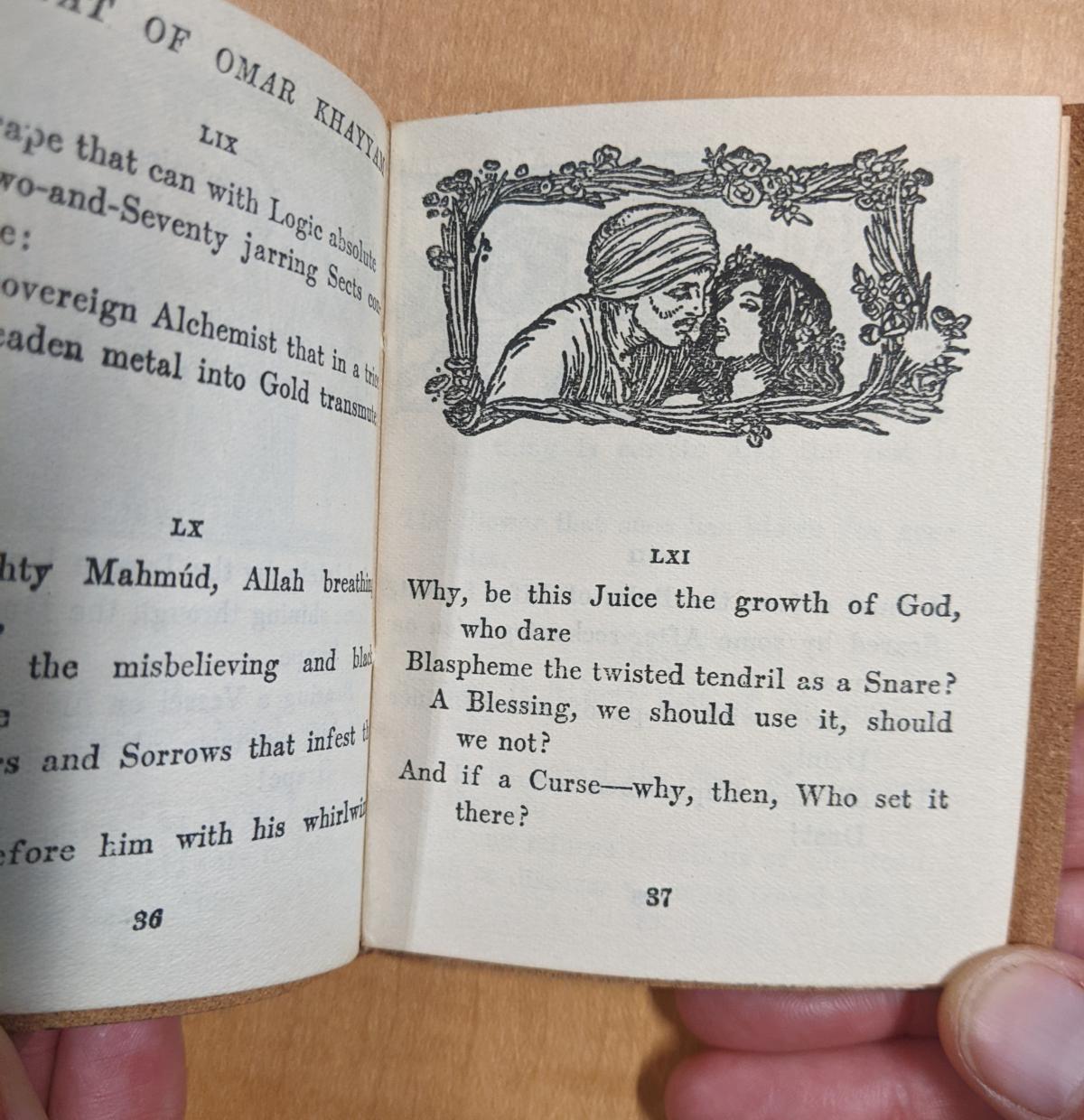 This highly-sexual metaphor seems plausible given the illustration the publishers chose to accompany this ruba'i: a man in a turban leaning down over a woman with her hair down, they seem moments away from a kiss. The contrast is good, giving the image clear shapes despite the minimal details. The negative space and lack of background isolates the two: we see only them and they see only each other. The frame is botanical with blooms giving shape to the border, while also serving the purpose of preventing too sharp of a line; the flower in the woman’s hair is the same as those found encircling this romantic moment.