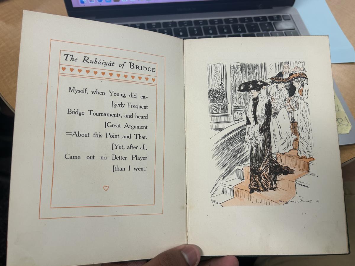 Of course, this is an outlier of an idea from the rest of the Rubáiyát. The Rubáiyát has different themes and mentions of playing the game of bridge in a group setting for fun, and to enjoy the game with other people. But this one illustration shows that some people only played bridge because they didn’t want to be an outcast from the rest of the crowd.
