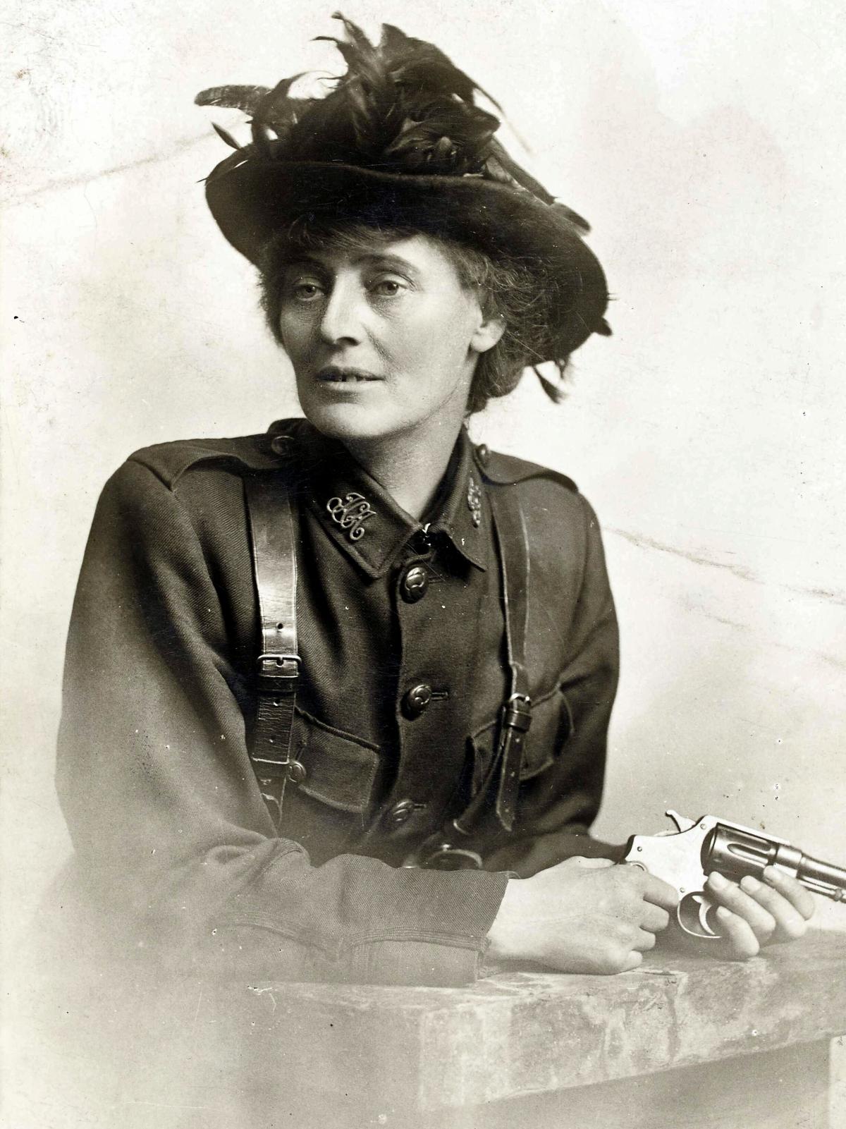 In case there was any doubt that Countess Makievicz was a strong woman, this picture depicts her wearing her Irish citizen army uniform and holding a gun.