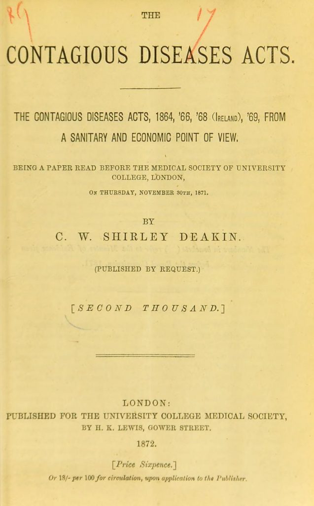 Luddy, Maria. “Women and the Contagious Diseases Acts 1864-1886.” History Ireland, 18th-19th Century Social Perspectives, 18th–19th - Century History, Features, Issue 1 (Spring 1993), Volume 1, 18 Mar. 2013, www.historyireland.com/18th-19th-century-history/women-and-the-contagio….
