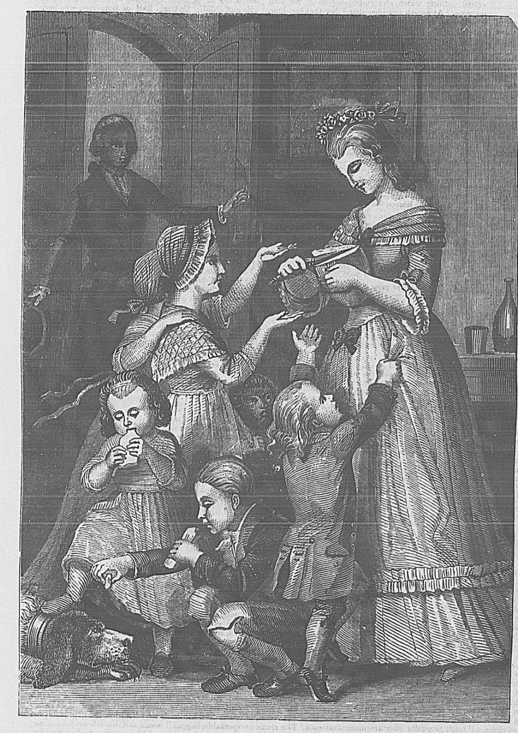 Illustration from a periodical depicting Charlotte from Goethe's "The Sorrows of Werther" cutting bread and butter for children.
