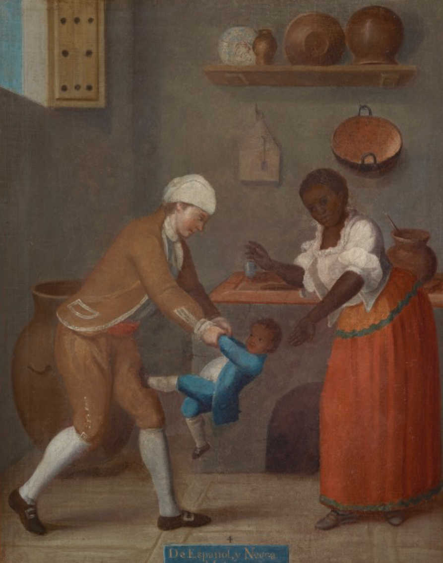 This Casta painting (circa 1775) by the Spanish artist, Fransisco Clapera, gives a picture of a family in New Spain. The painting shows a smiling child as he plays with his dad, while his mother appears to be watching over him in a caring way, ensuring he doesn’t hit his head. The family dynamic depicted in the Casta painting highlights the harmonious culture of New Spain. There is a great family dynamic, but what other unspoken dynamics and stories are shown? This painting exemplifies the mixing and blending of races in marriage. The family dynamic of a fair-skinned man married to an indigenous woman and the clear contrast between the shades of their skin show emphasis of the painting on race.