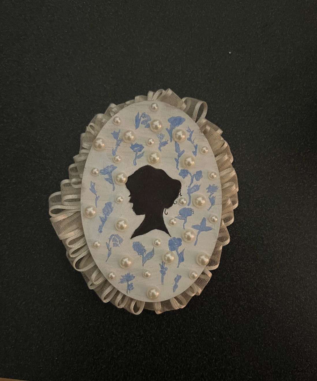 Students Watching a Printing Demonstration, Photograph by Catherine Golden, 2025. For my Elizabeth Bennet silhouette, I started by watching Dr. Golden’s demonstration of the printing machine, but since I’m not the most tech-savvy, I skipped the digital route and drew the silhouette by hand instead. I knew I wanted to include pearls like Elizabeth’s hairpins in the 2005 film, and Regency blue, a color I always associate with her. Working alongside my classmates made the process really fun, even though I struggled at first with painting tiny blue flowers without a small enough brush. After getting a finer brush, I fixed them up as best I could. The hardest part came at the end, when I decided the silhouette needed a border. I bought sheer ribbon, hand-bunched it into frills, and glued it to the back of the frame with super glue, getting it all over my hands in the process! It took about an hour and a half and turned out a little uneven, but I was proud of the final result and definitely learned that hot glue is the better choice next time.