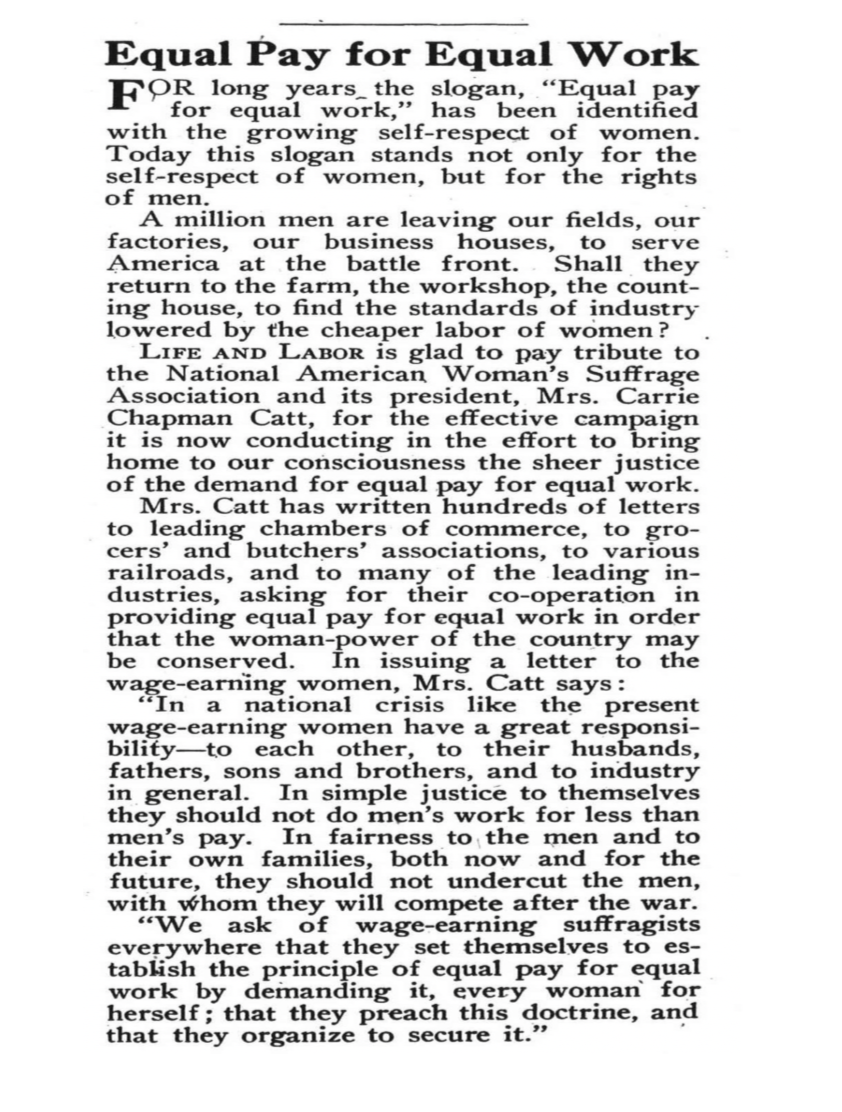 "Equal Pay for Equal Work." Life and Labor, vol. 7, no. 9, Sept. 1917, p. 142. Women's Studies Archive, link.gale.com/apps/doc/BQQIRO951402392/WMNS?u=gale&sid=bookmark-WMNS&xid=48ca4f07. Accessed 11 Oct. 2023