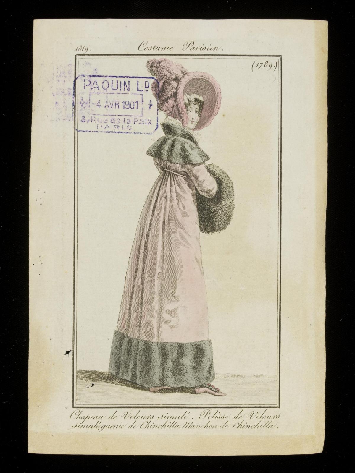 A back view of a pink velvet pelisse robe, found in a Fashion Plate published in 1819. https://collections.vam.ac.uk/item/O576878/chapeau-de-velours-simulé-pelisse-fashion-plate-unknown/