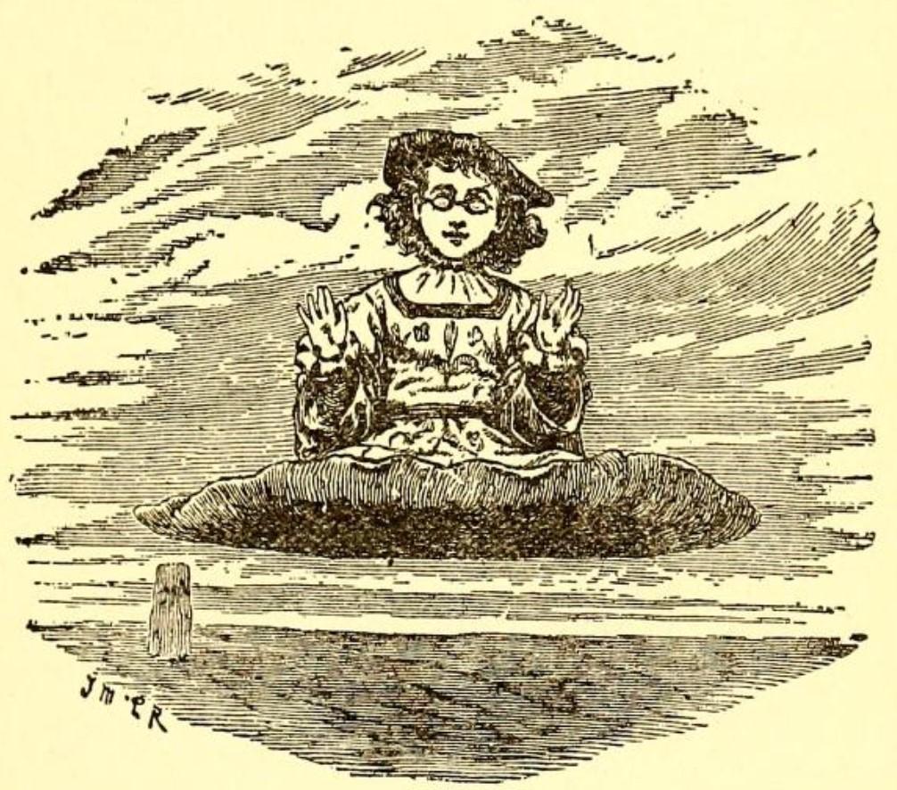 This image is sourced from chapter 5 of Maria Dinah Craik's version of The Lame Little Prince and his Travelling Cloak, which was uploaded on Cove. The image depicts Prince Dolor flying through the open air outside his tower in his traveling cloak, wearing his newly acquired pair of glasses.