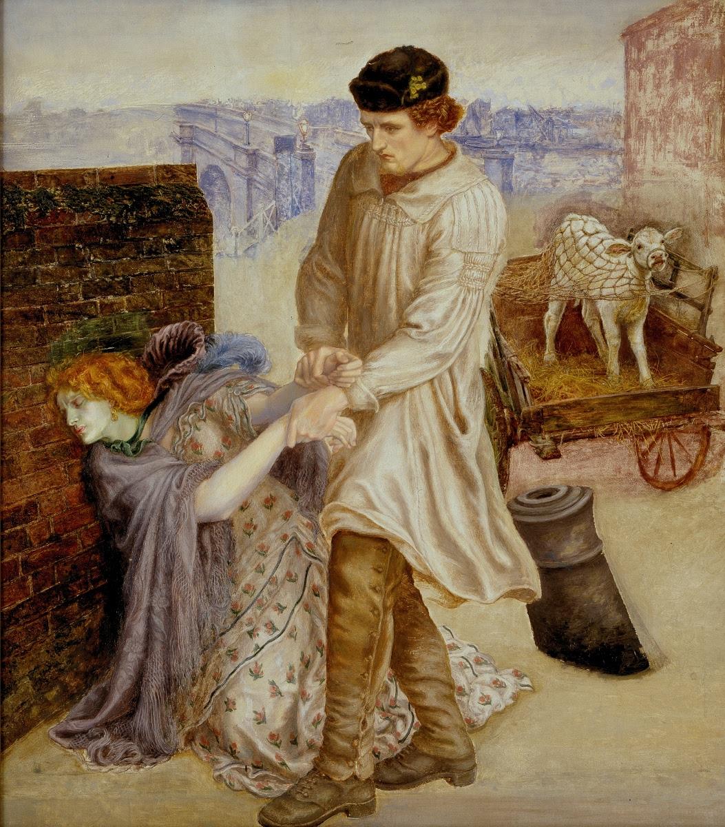 This painting was created by Dante Gabriel Rossetti showimg a feeble woman laying against a will seeming to give herself to her ex lover. This painting is a visualization of prostitution during the 1800's. Another viewpoint of this painting is a woman who seems to be fighting off a man, but she seems as if she is weak. As you pay close attention to the details you will see how she has a cape to cover her head and dress that goes down to her ankles. During the Victorian era women were often seen as the “Angel in the House”. According to the Victorian poets’ women were expected to be conserved. They were expected to be innocent and helpless by any means. Victorian women were expected to feed the family, stay in the house, not find a job, clean, and support their husband with everything. With either having to choose a life of being a stay-at-home wife some women often decided to fall into prostitution. This led to the name “fallen women”. These fallen women often faced consequences like early death of diseases. As seen in this painting the women seems as if she if pale. This shows the life that is draining out of her when she falls into prostitution. This example of an "Angel in the House" and "Fallen Women" can be seen in a poem called Goblin Market by Christina Rossetti. In this poem Christina shows us how women were treated during the Victorian Era. In this poem Laura was called into prostitution by the Goblins that "seemed" friendly. After she fell for them and ate the fruit(sex) now has a strong desire for sex and because of that she is not able to complete household things and loses her chances of becoming a successful wife or mother (the goal of women during the Victorian Era). Lizzie could not stand to see her sister like this, so she went to try to save her. While doing so was beaten, taunted, had her clothes torn, etc.