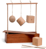 Pictured here is Gift No. 2, which is comprised of a set of three hard, naturally coloured three-dimensional shapes. The shapes in Gift No. 2 include a sphere (Gift No. 1), a cylinder, and a cube. Each shape hangs from a wooden dowel using a string. According to Froebel, the sphere in Gift No. 1 and Gift No. 2 represents "the material expression of pure movement" (70), while the cube represents "the material expression of complete rest" (70). The inherent opposition in the two toys is meant to encourage the developing child to explore connections between opposites and contrasts that occur within the natural world (73). The movement of the shapes hanging from the dowel are meant to encourage experimentation with motion, movement, physics, and geometry.