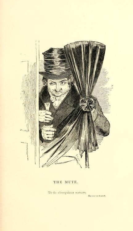 In this passage and in the lines that follow, Mr. Sowerberry proposes to his wife that they make Oliver Twist work for them as a funeral mute for children's funerals. While Twist may be one of the most famous examples of mutes in literature, child mutes were actually less common with the job usually being taken by adult men. Popular in the 1700s and declining towards the end of the 1800s, the mute profession entailed "stand[ing] vigil outside the door of the deceased, then accompany[ing] the coffin, wearing dark clothes, looking solemn and usually carrying a long stick (called a wand) covered in black crape" (Byrne). They typically operated on an irregular job-by-job basis, but still stood out as part of an funeral industry that increased in extravagance the further it moved into the Victorian era. Dickens himself actually held great distaste for mutes and the elaborate funerals they symbolized which led him to use them as vehicles in many of his works (e.g. Martin Chuzzlewit) to mock the industry and the barriers it presented to the lower classes (Admin). Dickens' critique of them contributed to their decline in popularity as did the perpetually shifting Victorian ideas about funeral proceedings, status, and representations of wealth in death. By the 1890s into the early 1900s, mutes as a funeral staple were a thing of the past (Byrne).