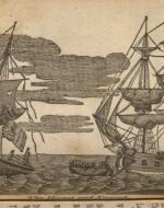 This image depicts a confrontation between an American and a British ship, each displaying their national flag. The flag of the British ship, on the left, is upside down. Both ships have tattered sails. The back of the British ship is sinking into the water, and two of its masts have been reduced to jagged stumps. In contrast, the American ship sits level on the water and retains its three masts; the only evident damage is some holes in its sails. The British are abandoning their ship in two row boats and are pulling towards the American ship.3This image depicts a confrontation between an…