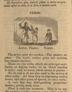 The image is set in what appears to be a schoolroom. The master holds a stick above his head, preparing to give "strokes" to the young boy he grips by the elbow. The boy, dressed in a long coat and pants, looks up at the master. To their right, another boy sits in a chair, looking out in the direction of the viewer. The master is labeled "Active," the boy he intends to hit, "Passive," and the seated student, "Neuter"; the image's title, "Verbs," appears in capital letters above the scene.3The image is set in what appears to be a schoolroom. The master holds a stick above his head, preparing…