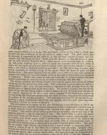 In this drawing of a printing machine patented by “Messrs. Applegath and Cowper,” two men work at the press while one man operates a fly-wheel pulley system. The figure at the back of the machine piles sheets of paper while