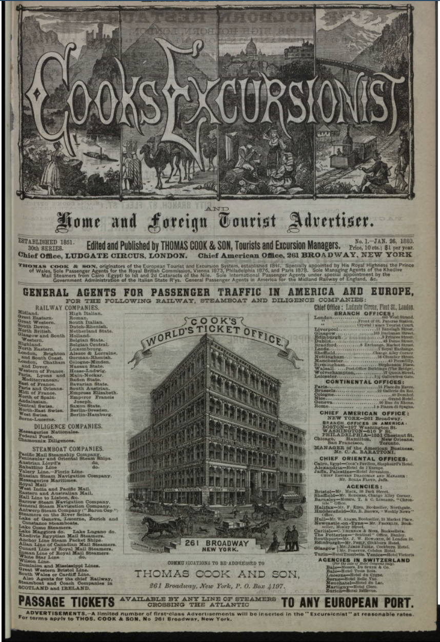 Cook, Thomas. “Cook’s Excursionist and Home and Foreign Tourist Advertiser, Volume XXXVIII, No. 1-12.” Leisure, Travel & Mass Culture: The History of Tourism - Adam Matthew Digital, Thomas Cook Archives, 1888, www.masstourism.amdigital.co.uk/Documents/Images/TCA_N_Excursionist_188….