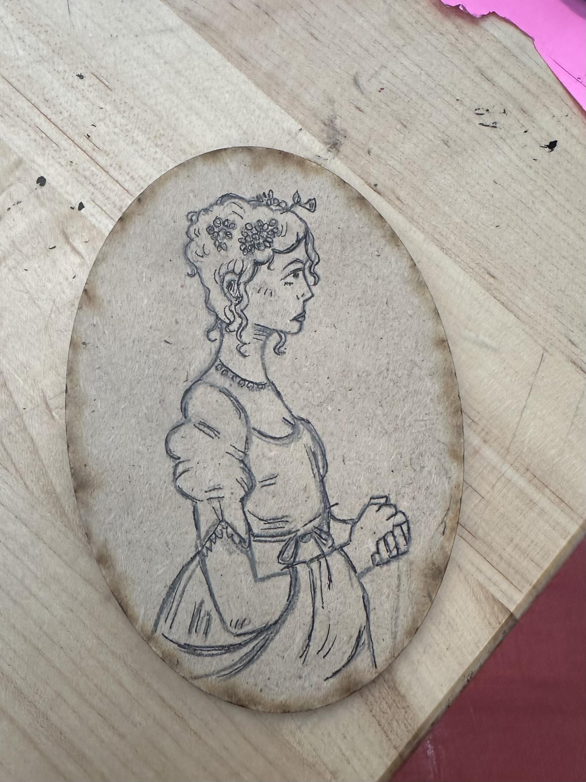 Collage of The Process: 1. Lorelei Diligently Illustrating, taken by Lorelei Heuer 2025. I used the timed-photo function on my camera to capture a moment of me working, making it look candid. I tried to pose in a proper way as l imagine a nineteenth-century woman would look writing a letter or designing a silhouette. I function as an artist who has been commissioned to draw two young ladies. I have a thoughtful look as I think about how the ladies would have been drawn and how to characterize them though the portraits.