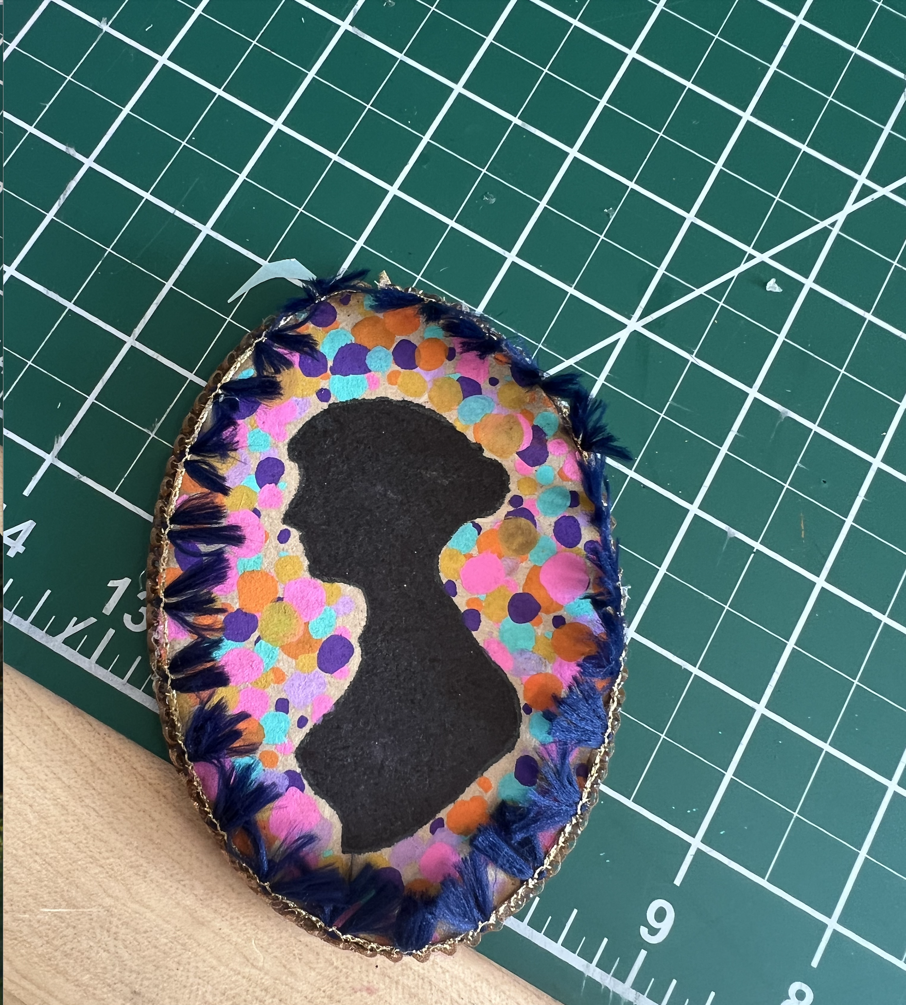 Crafting the Harriet Smith Silhouette, Photo by Charlotte Ballantoni, 2025. This second picture depicts me working on the border of my piece. I wanted to create something that would go around the edge of the silhouette, and I originally thought that crochet would be interesting. I thought that the texture of the yarn would add visual intrigue, so I made a chain in a beautiful navy blue yarn. However, I ended up not liking how it looked, and I switched to the gold ribbon with navy frill seen in the final product. I think that this piece better represents Harriet's adaptation throughout the novel. She becomes a finer, more elegant woman under Emma's care, and I thought this was reflected in the change of border. Harriet herself would have chosen the crocheted piece, while I think Emma would have opted for the ribbon. Perhaps that means I should have used the crocheted piece, but I wanted to demonstrate how Harriet's choices throughout the novel are almost never her own but instead inspired by what other people, particularly Emma, say to her.