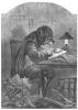 Harrison Weir, "The Literary Dog," for Funny Dogs with Funny Tales, by James Hannay, 1857, The Victorian Web, scanned by Simon Cooke. This second illustration is an anthropomorphic drawing of a grown mid-Victorian middle-class dog, cast in the role of a struggling writer living on Grub Street in Caneville. Weir and many other writers, including Hannay and Elwes, collaborated on various tales of animals depicted in the guise of Victorians, presenting society in a satirical manner. The use of the literary dog's lamp, books on shelves, paper, quill pen, and writing desk are objects that Weir uses to epitomize the studious behavior of a Victorian writer captivated in his work. The dog's resilience to keep writing while the oil lamp is lit allows the audience to suggest that his work is the most crucial part of his day. Weir's use of the dog to refer to the animal's strength and determination recalls traits of humans and their literary passions.