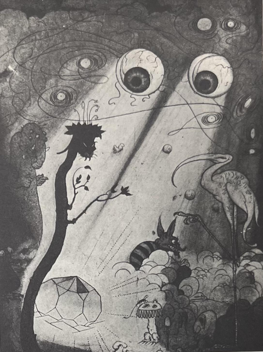Sidney Sime labels this illustration “He distinctly saw within himself the drug he had chewed” after H.E. Gowers' article on “Haschisch Hallucinations” in Strand Magazine, December 1905, following a doctor’s drug hallucinations. Two large eyeballs gaze towards a gemstone, amongst a distorted world of “Half animals and half plants” (Gowers 662). Sime’s eye imagery and the light emitted from them is reminiscent of the popular Victorian fears of “new x-ray technology” allowing you to view unseen worlds inside bodies (Atzmon 8). Sime uses rays to “emphasize both revelatory and destructive power in his illustrations” (Atzmon 8). In this case, the rays are a revelatory power that guide us to the source of this unseen world— the drug that “looked like an emerald, from which thousands of sparks were emitted” (Gowers 662). The drug produces hallucinations that cause the doctor’s slip into this distorted realm. Sime seems to invite his turn-of-the-century audience to consider hallucinations, like popular notions of x-rays, to “...do what the human eye and mind could not” (Atzmon 8) and gain sight into unimaginable worlds, which his illustration itself seems to grant viewers.