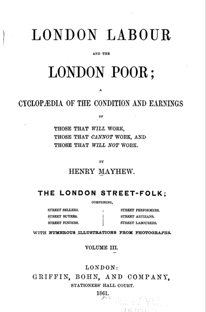 Mayhew, Henry. London Labour and the London Poor. III, Dover Publications, 1968, Google Books, https://books.google.com/books?id=tVtHAAAAYAAJ&printsec=frontcover#v=on…, Accessed 27 Apr. 2022.