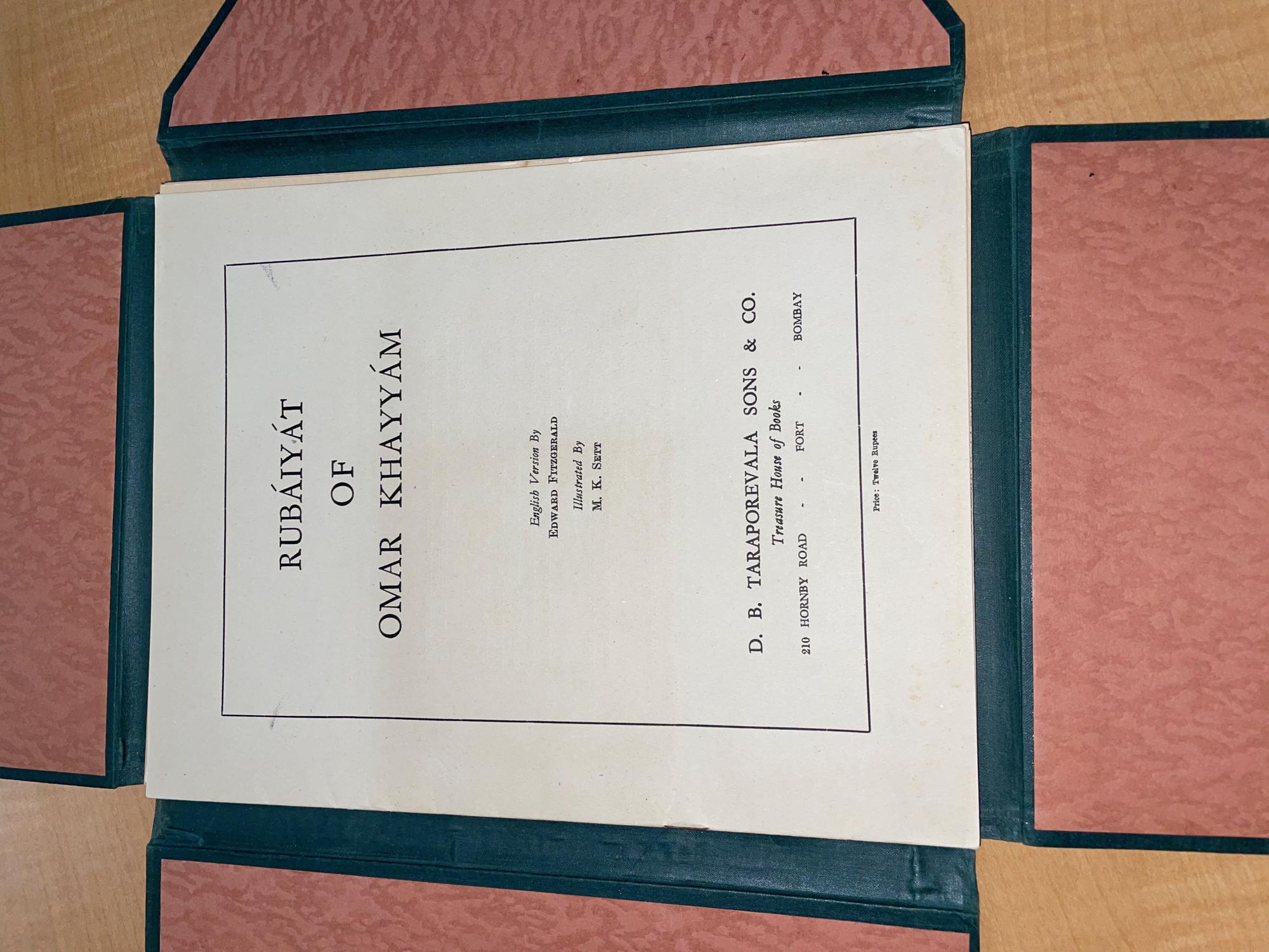 What I find most interesting about the history of this version of the Rubáiyát was how little is known about the illustrator outside of what he's done for this edition. What I was able to find about this version of the Rubáiyát was all due to the title page, the author's note, and the introduction. On the title page, the title, translator, illustrator, publisher, publisher’s address, and the price were all laid out for me. Something easy I was able to discover was the price. The very bottom of the title page reads, “Price: Twelve Rupees.” In 1946, when this edition is believed to have been published, twelve rupees were equal to approximately thirty cents in U.S. dollars. This offers some insight into the economic context and accessibility of the book at the time.