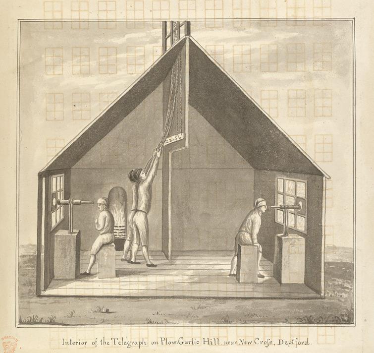 View of the interior of the telegraph station established by the government on Plow Garlic Hill, and another called Watson's Tower. Both images show how telegraph stations were manned: operators would watch through a telescope and wait for visual messages from station to station, by utilizing wooden panels painted black and white that could be rotated, indicating certain letters/numbers. Electric models emerged later. The first commercial route, pioneered by William Cooke and Charles Wheatstone in 1837, connected Euston Station and Camden Town, a distance of 1.1 miles. Their method had a dial and set of wires that would trasmit into a wooden machine that would indicate the correct letters. This was later replaced by the American Samuel Morse's simpler system of code, because less wires were needed. Routes typically ran along established railroads.