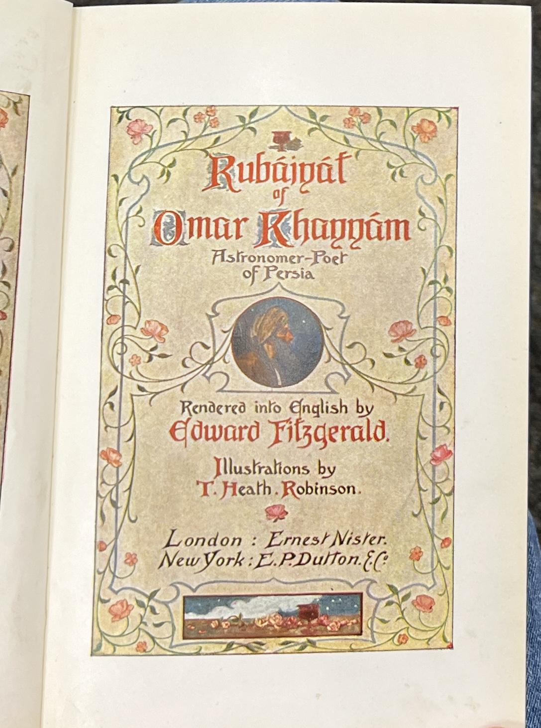 After being translated, illustrated, and likely edited in England, and then printed in Bavaria, this edition was published as a joint effort between Ernest Nister of London and E.P. Dutton & Co. of New York. Neither of these publishing houses are still operating today, though they both held great cultural significance in the literary world for many decades. Ernest Nister was a German publisher who moved his headquarters to London at the end of the 19th century, and at that time he also secured a partnership with Dutton to expand his audience into America; the library at University of North Texas described Nister’s company as one that “produced many children’s books of superior quality in both illustration and printing.” Nister’s roots in German publishing is likely one reason why this edition of the Rubáiyát was outsourced to Bavaria for printing, and it seems as though this decision may have led to much of the acclaim for the quality of his publishing. His partner, Edward P. Dutton, founded his company as a bookseller in Boston before relocating to New York in 1869 and beginning to publish books as well; five years after Dutton’s death in 1923, the publishing branch split off into E.P. Dutton & Co. under the leadership of Dutton’s protege, John Macrae (Syracuse University Libraries). The company went on to become one of the leading independent publishers in the United States for nearly forty years before being acquired by the Penguin Group in 1986. It is impossible to tell by looking at this copy of the Rubáiyát whether it was originally sold in London or New York, but either way, its publication occurred during the early phases of the “Fitz-Omar craze,” and it likely attended at least one meeting of an “Omar Khayyám Club” chapter soon after its purchase.