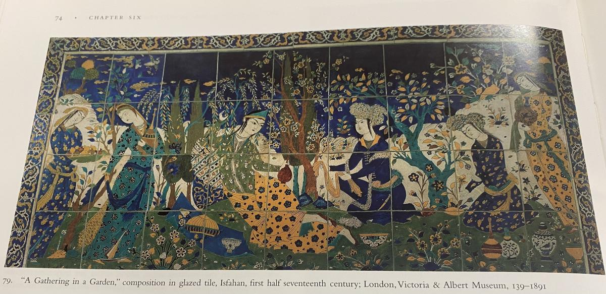 Since Dulac was heavily involved in the aesthetic movement, he likely drew inspiration for this edition from Isfahan artists of the seventeenth century (and these artworks of oil on canvas (see FIGURE 1) and glazed tile (see FIGURE 2) later became the overall standard for the western interpretation of eastern artwork (and this was the sort of artwork that one could find in editions of One Thousand and One Nights tales of Arabia). During the time period from 1890 to 1930, it was more common for British artists to use more muted colors rather than the more vibrant tones of the seventeenth century Isfahan artists and, while the illustrations of the 1909 edition of The Rubaiyat drew inspiration from the seventeenth century Isfahan artists, Dulac’s illustrations definitely have a more muted color palette).