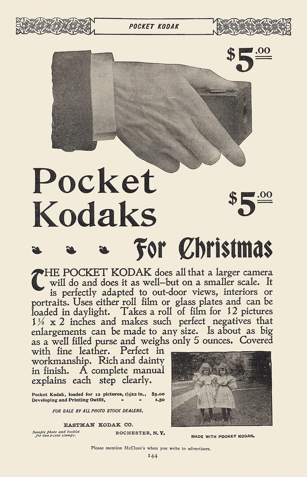 McClure's Magazine 1895. File:Pocket Kodak Camera Advert (McClure's Magazine 1895).jpg. Image. Wikimedia Commons, 1895, https://commons.wikimedia.org/w/index.php?title=File:Pocket_Kodak_Camera_Advert_(McClure%27s_Magazine_1895).jpg&oldid=672323815. Accessed 3 Dec. 2025