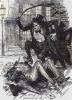 Edmund Joseph Sullivan’s illustration depicts the murder of Sir Danvers Carew from Mr. Hyde, which the original text from Robert Louise Stevenson had never fully shown. What appears striking about the depiction comes from the juxtaposition of Hyde attacking from above to Carew laying down below him. Hyde is depicted throwing an entire rage onto Carew with his right hand whacking the gentleman with a cane while his right arm stomps over the poor man’s body. His left hand is clawed expressing the sense of anger towards Carew as he murders the fellow away. On his face, Hyde expresses a sneer from his mouth while he looks down viciously at his victim. Charles Darwin noted in The Expression of the Emotions in Man and Animals how sneering of the mouth “protruded during rage in a manner, the meaning of which I do not understand, unless it depends on our descent from some-like animal” (155). The depiction of Hyde mirrors that of the ape-man stereotype commonly associated against African Americans. Behind Hyde, his shadow illuminates on the brick wall making him seem like an ape on a rampage. It makes it even worse with Sir Danvers Carew, who is drawn as white with his head tilted backwards and chess up after being attacked by Hyde.