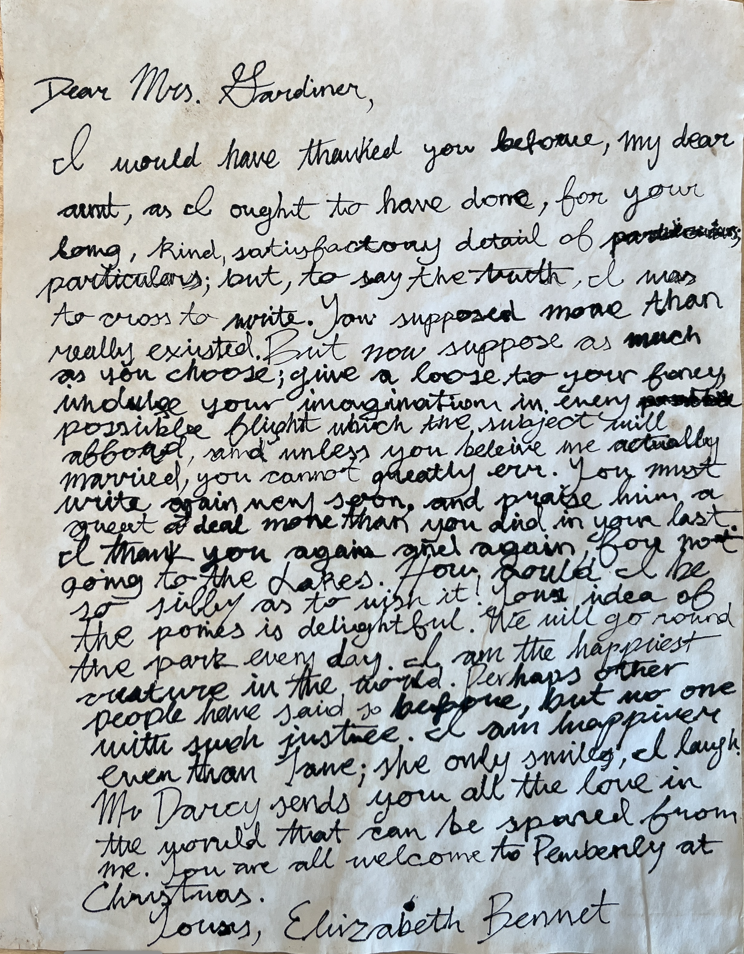 Elizabeth Bennet's letter to her aunt, Mrs. Gardiner, in Pride and Prejudice (1813) reflects the role that letter writing played in the Regency era by being the main form of communicating news. Additionally, Elizabeth's letter emphasizes how letters were used to express affections during the Regency era. Despite the rough beginning of Elizabeth Bennet and Mr. Darcy’s relationship, they find a happy and joyful ending together. This letter successfully highlights Elizabeth’s happiness and success in marrying for love. This joy is clearly depicted as Elizabeth proclaims to be the “happiest creature in the world.” Elizabeth even goes so far as to compare her happiness to that of Jane, noting, “she only smiles, I laugh.” This difference is important as Elizabeth and Jane have a strong sisterly bond throughout the novel, where Elizabeth views any success of Jane's as a success for herself, too. Therefore, the written comparison to Jane’s happiness continues to highlight the extent of Elizabeth’s happiness. This letter is also special, as in contrast to other Jane Austen novels, Pride and Prejudice (1813) is the only one where the reader gets to hear of the heroine’s happiness directly from her. This virtual display case focuses on the depictions of Elizabeth's happiness, as well as Mr. Darcy and her family, as a result of Mr. Darcy and Elizabeth's marriage. The first image shows the recreated letter from Elizabeth Bennet to Mrs. Gardiner. The second image shows the process of recreating this letter, and the third shows the folded letter. The fourth image depicts Elizabeth and her father, Mr. Bennet, notably happy at the end of the 2005 film adaptation of Pride and Prejudice. Lastly, the fifth image illustrates Mr. Darcy and Elizabeth in the 1995 TV Series adaptation of Pride and Prejudice, as well as in the 2005 movie adaptation. All these images work together to depict the joy and happiness felt by everyone at the end of Pride and Prejudice.