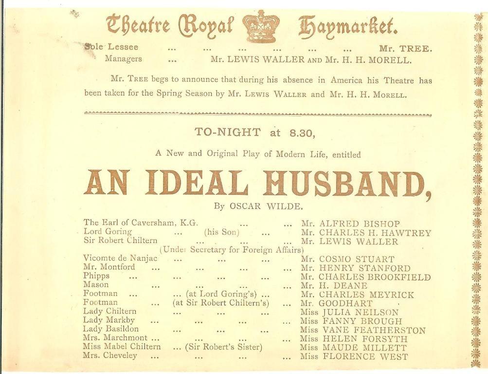 Wilde's four-act play written in 1895 centers around a high-class party at the home of Sir Robert Chiltern and his wife, Lady Chiltern. During the party, Lady Chiltern's worst enemy, Mrs. Cheveley, attempts to blackmail Sir Chiltern into her fraudulent scheme which includes building a canal in Argentina. Sir Chiltern cannot refuse due to the damning information Mrs. Cheveley knows about Sir Chiltern which his having to do with buying stock in the Suez Canal just days before British Rule announced its purchase. He made his fortune doing so and does not want to lose his career or marriage over this information, so he agrees. When Lady Chiltern hears about his agreement, she begs him to renege his promise and being an "ideal" and compliant husband listens to his wife despite the doom this would induce. The play goes on to have many interesting turns of events and was quite successful having 124 performances at the Haymarket Theatre in London starting in 1899.