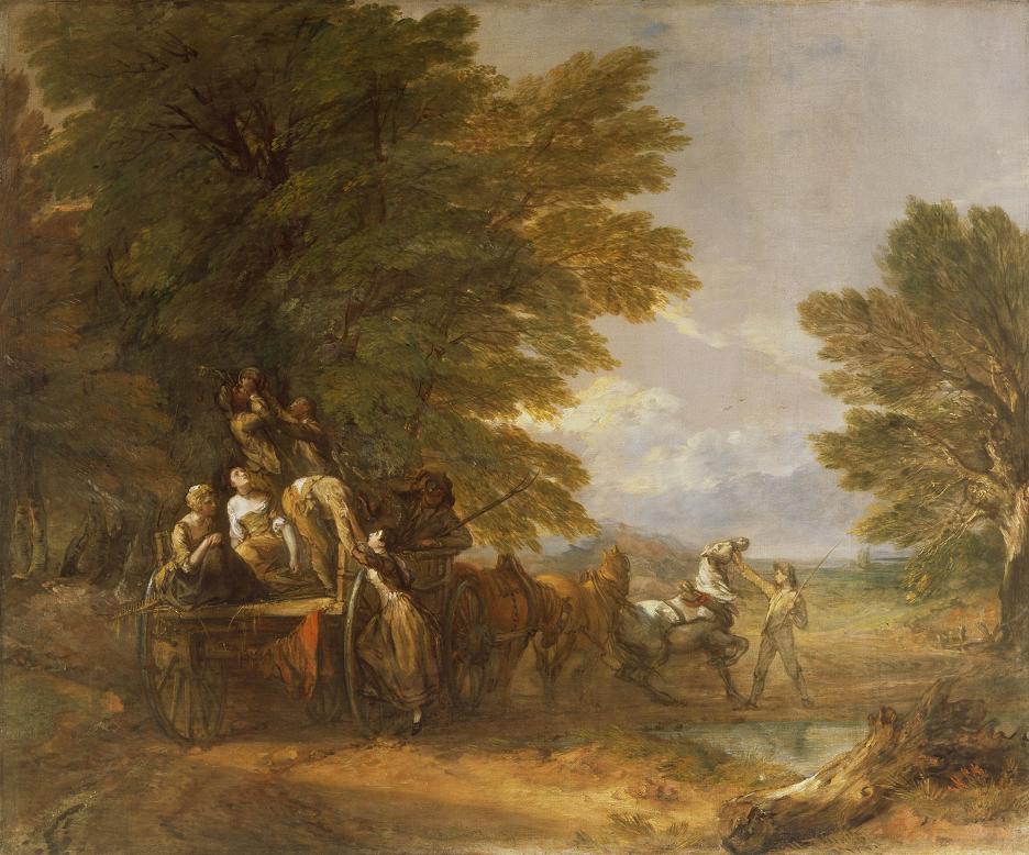 The landscape style in many seventeenth-century Dutch paintings honored the more realistic view of life, which included everyday people going about their everyday jobs. Gainsborough, inspired by his local surroundings, was attracted to this style of Dutch landscape from the previous century. This is noticed in his 1767 painting, The Harvest Wagon, in which a group of peasants travel in a wagon and are led by multiple horses. This scene is very different from the ideal "Italian" landscape. For example, Claude’s Landscape with Apollo and the Muses (1652) portrays a river god lounging on a section of land while the muses joyfully gather at a clifftop. But in The Harvest Wagon, the characters are normal; they don’t have any mystical abilities. They are on their way somewhere, so they aren’t lounging. A young man is seen helping a woman onto the wagon while a younger person handles the horses up front.