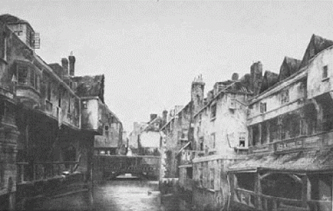 “Crazy wooden galleries common to the backs of half a dozen houses, with holes from which to look upon the slime beneath; windows, broken and patched, with poles thrust out, on which to dry the linen that is never there; rooms so small, so filthy, so confined, that the air would seem to be so tainted even for the dirt and squalor which they shelter; wooden chambers thrusting themselves out above the mud and threatening to fall into it – as some have done; dirt-besmeared walls and decaying foundations, every repulsive lineament of poverty, every loathsome indication of filth, rot, and garbage: all these ornament the banks of Jacob’s Island” (Dickens 487-488).