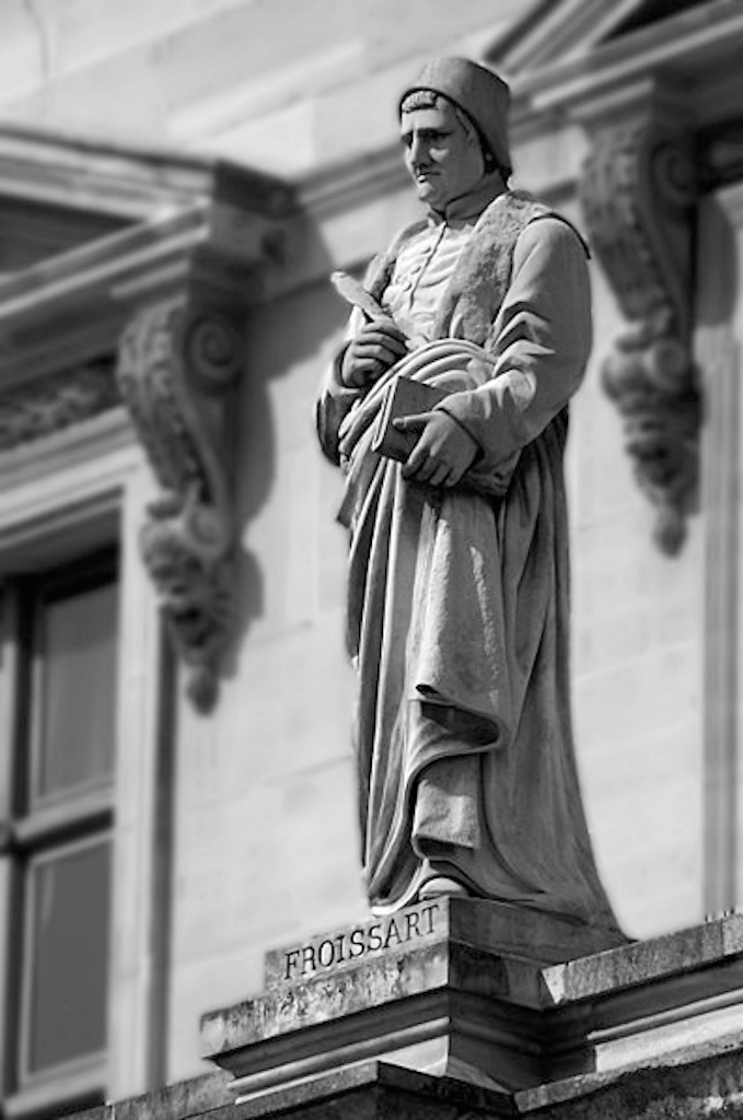 Jean Froissart, French poet, historian, and, as John of Castel Neuf identifies him in “Concerning Geffray Teste Noire,” canon of Chimay, lived between roughly 1333 and 1400. Born in Valenciennes, Froissart received his education from the Church before embarking on a literary career. After writing for a number of different patrons, he became the personal secretary of Philippa of Hainaut who was then Queen of England and who had also been born in Valenciennes. He wrote poetry while working for Philippa, and both before and after her death in 1369, just as the Caroline War broke out, he composed Méliador, a chivalric verse romance.