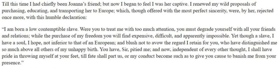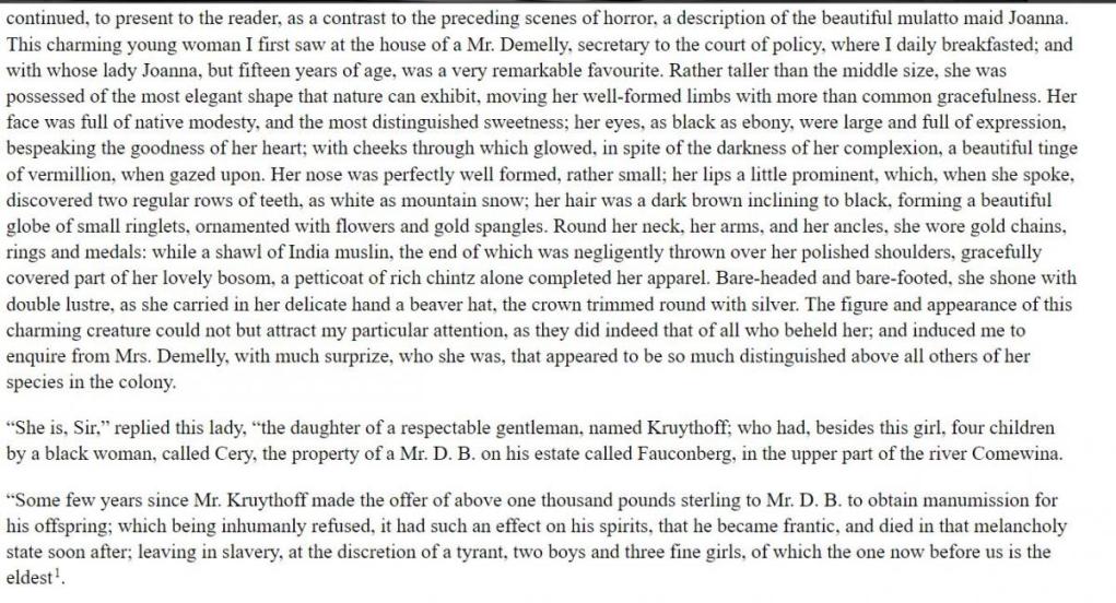 About Joanna from Narrative on April 11th, 1773 Stedman negotiates with Joanna's mother to purchase Joanna's services. Stedman states she is a "Mulatto maid" who seems to be of 15 years of age. He states that she seemed more distinguished than the rest of her "species".