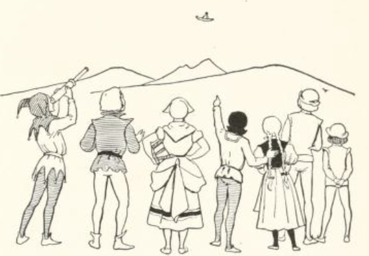 This illustration evokes a supernatural, almost UFO-like quality surrounding Prince Dolor, emphasizing both his distance from the masses and his divine elevation above them. It underscores the hierarchical gap between what a king is traditionally meant to represent and how the child, in many ways, redefines masculinity by embodying a spiritual presence that transcends conventional power. The child rises physically above his imagined role as a knight and symbolically beyond the limits of traditional masculinity. The framing of the image—from the perspective of onlookers gazing upward—positions the viewer alongside the crowd, reinforcing the awe and reverence the figure inspires. In doing so, the illustration suggests that Prince Dolor’s authority and masculinity are no longer grounded in strength or dominance but in a higher, spiritual form of leadership rooted in empathy, imagination, and moral clarity.