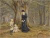 In 1880, British watercolorist Helen Allingham created an artwork titled “The Lady of the Manor” using watercolors. This painting features an unnamed lady in the center of the image in front of a large tree, looking down at two children who appear to be collecting sticks and flowers in a hat. In the background, there is a dense forest, a dog, some deer, and a manor. From the title and eye-catching details of the painting, the viewer connects that the lady is the focal point of the painting and the manor is her home. The woman is further emphasized with the black dress she wears in the vibrant environment, drawing the spectator’s eye to her and her interaction with the children.