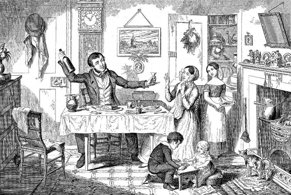 During the Victoria era, drinking was such a common behavior that alcoholism became a social problem. "Bottle 1" is the first image of The Bottle, a set of eight images that encouraged people to quit drinking; the artist, George Cruikshank was an alcoholic turned teetotaler (a man against drinking). In this image, the clock tells us it is only noon. However, the man has already started to drink. The family in the picture looks happy--the room is tidy and children play happily together, yet alchohol threatens their peaceful life. In fact, in the following pictures of the series, the family does suffered because of the master's addiction to gin. Akin to the father in Cruikshank's The Bottle, Emily and Anne Brontë include alcoholics in their fiction, arguably inspired by their alcoholic brother, Branwell.